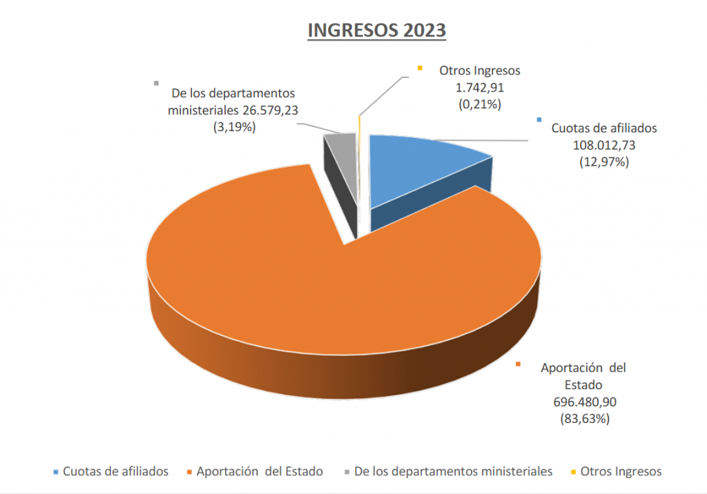 La ejecución presupuestaria de los ingresos en 2023 fue por importe de 832.815.776,19€, lo que supone un 99,29%. En el conjunto total de ingresos obtenidos, los afiliados del Instituto aportaron el 12,97% mientras que el Estado aportó el 83,63%. El resto del 3,40% son transferencias y subvenciones recibidas, así como otros ingresos diversos.